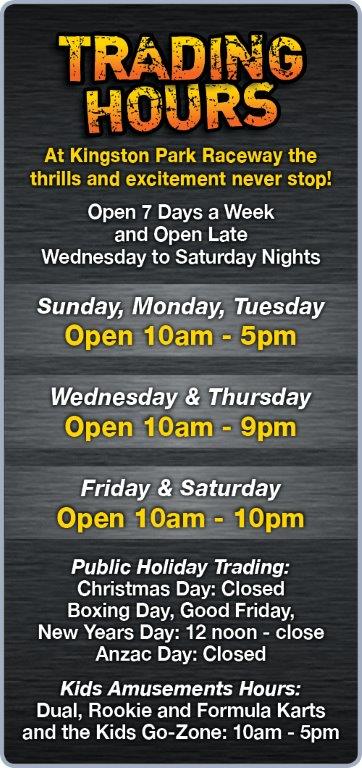 At Kingston Park Raceway, the thrills and excitement never stop! We’re open 7 days a week and, for your convenience, we’re open late 4 nights a week, including on Friday and Saturday nights.